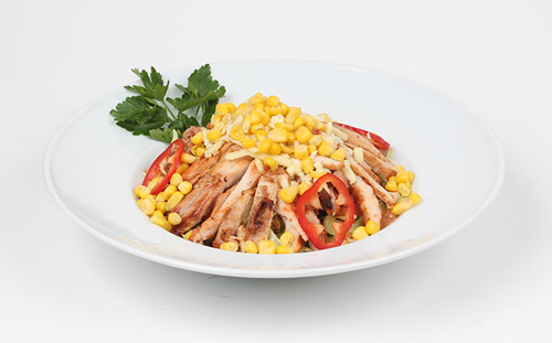 Kızarmış tavuk, göbek, özel sos, mısır, K.peynir